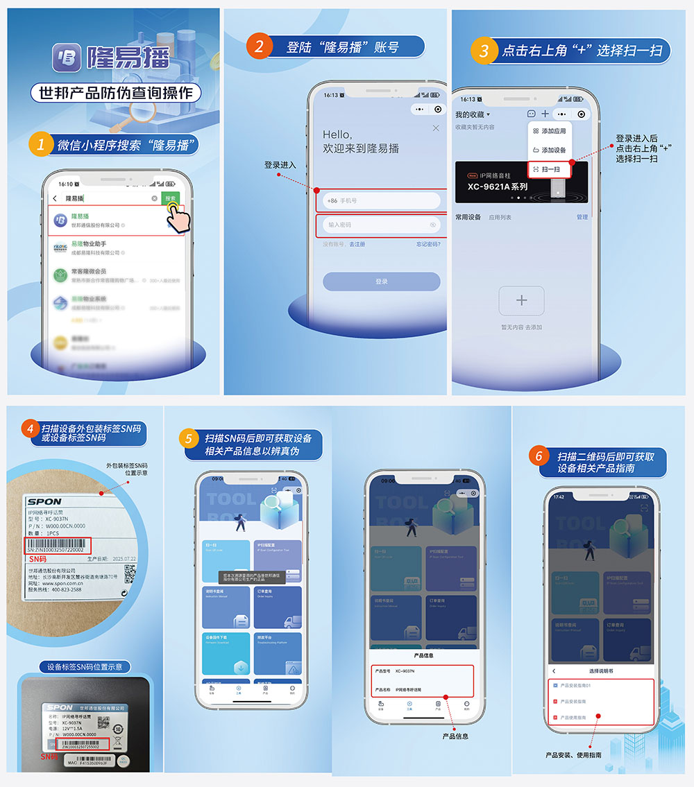 您可以通過(guò)手機(jī)微信搜索并打開(kāi) “世邦隆易播”小程序,使用小程序內(nèi)的“掃碼”功能,掃描產(chǎn)品標(biāo)簽上的 SN碼,即可快速、準(zhǔn)確地查詢(xún)產(chǎn)品的真?zhèn)涡畔⒓吧a(chǎn)溯源信息,有效保障您的權(quán)益。